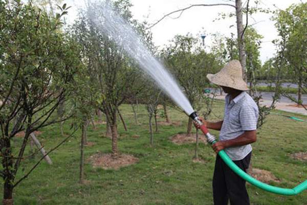 木本花卉根系入土深,分布面廣,吸水力強(qiáng),澆水量可適當(dāng)少些。